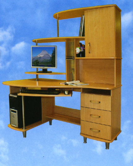 Компьтерные столы со специальной нишей для системного блока, выдвижной полкой для клавиатуры, полками для оргтехники, выкатными ящиками и секциями (открытые и с дверцами) для хранения вещей и документов.