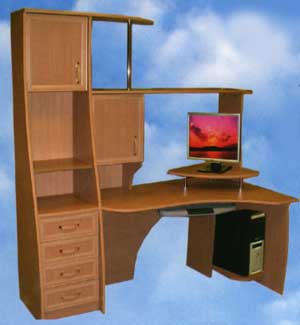 Компьтерные столы со специальной нишей для системного блока, выдвижной полкой для клавиатуры, полками для оргтехники, выкатными ящиками и секциями (открытые и с дверцами) для хранения вещей и документов.