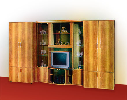Набор пристенной мебели «Норд». Классическая стенка с двумя шкафами по бокам. Шкафы двухстворчатые. Две симметричные вертикальные витрины по бокам и одна горизонтальная в центре, ниша под ТВ и аппаратуру.