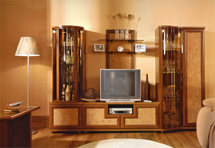 Модульная система. Стенка имеет малую и большую витрины, нишу под аппаратуру, закрытые секции с глухими распашными дверцами, шкаф-пенал, навесные стеклянные полки. Модель установлена на ножки.