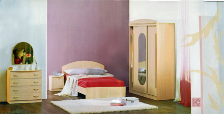 В комплект спального гарнитура входит широкая двуспальная кровать, прикроватные тумбы, комод с четырьмя выдвижными ящиками, вместительный шкаф-купе для хранения одежды, спальных принадлежностей и пр.
