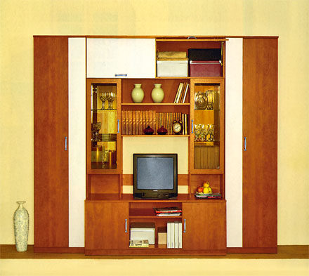 Стенка «Аллегро 1». Возможны различные комбинации цветов. Имеются шкафы для хранения одежды, спальных принадлежностей и пр., ниша под ТВ, секция для видео- и аудиоаппаратуры, секции со стеклянными, открытыми фасадами и с распашными дверцами.