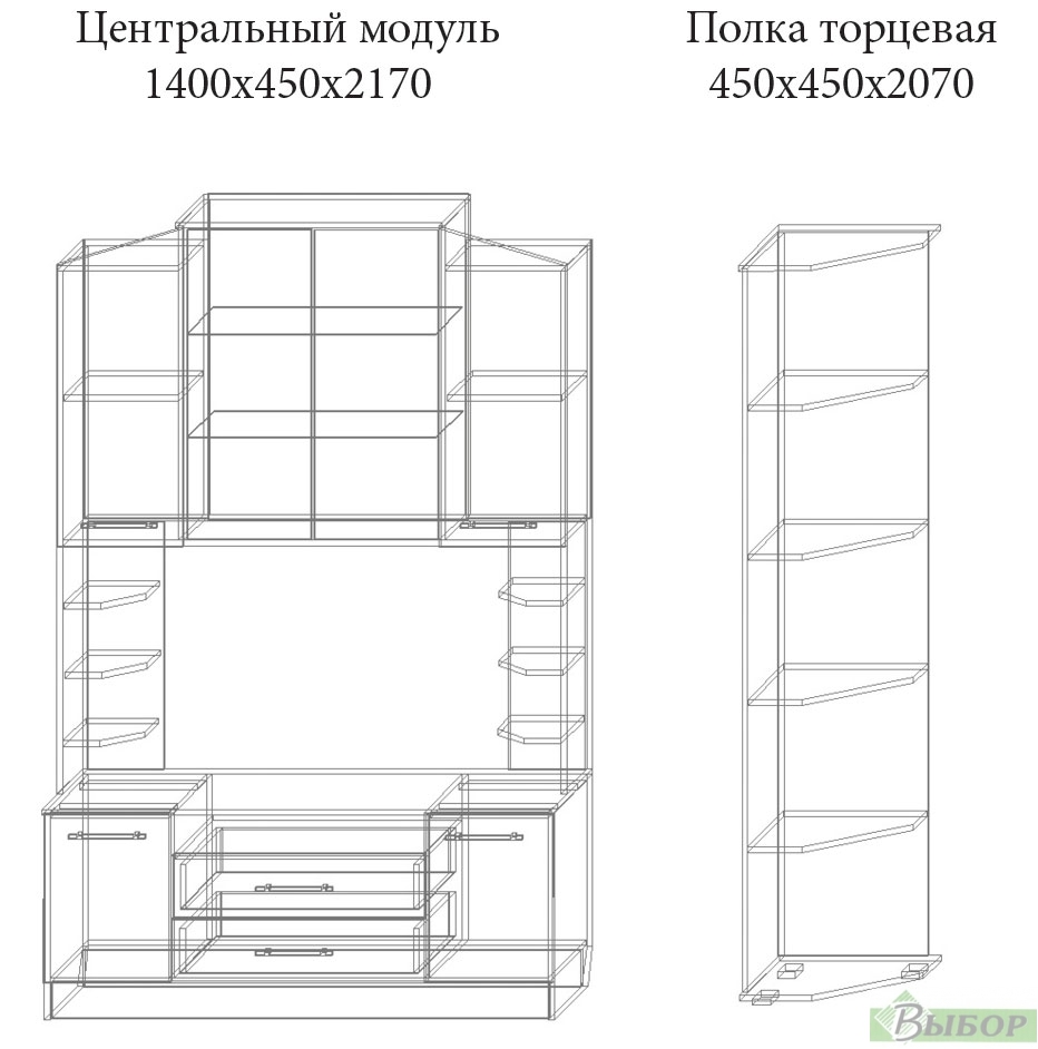 Варианты комплектовки: — при глубине шкафа 450мм используется выдвижная штанга — при глубине шкафа 550мм используется скалка В центральном модуле ниша под ТВ: с полками — 1370×670мм без полок — 970×670мм